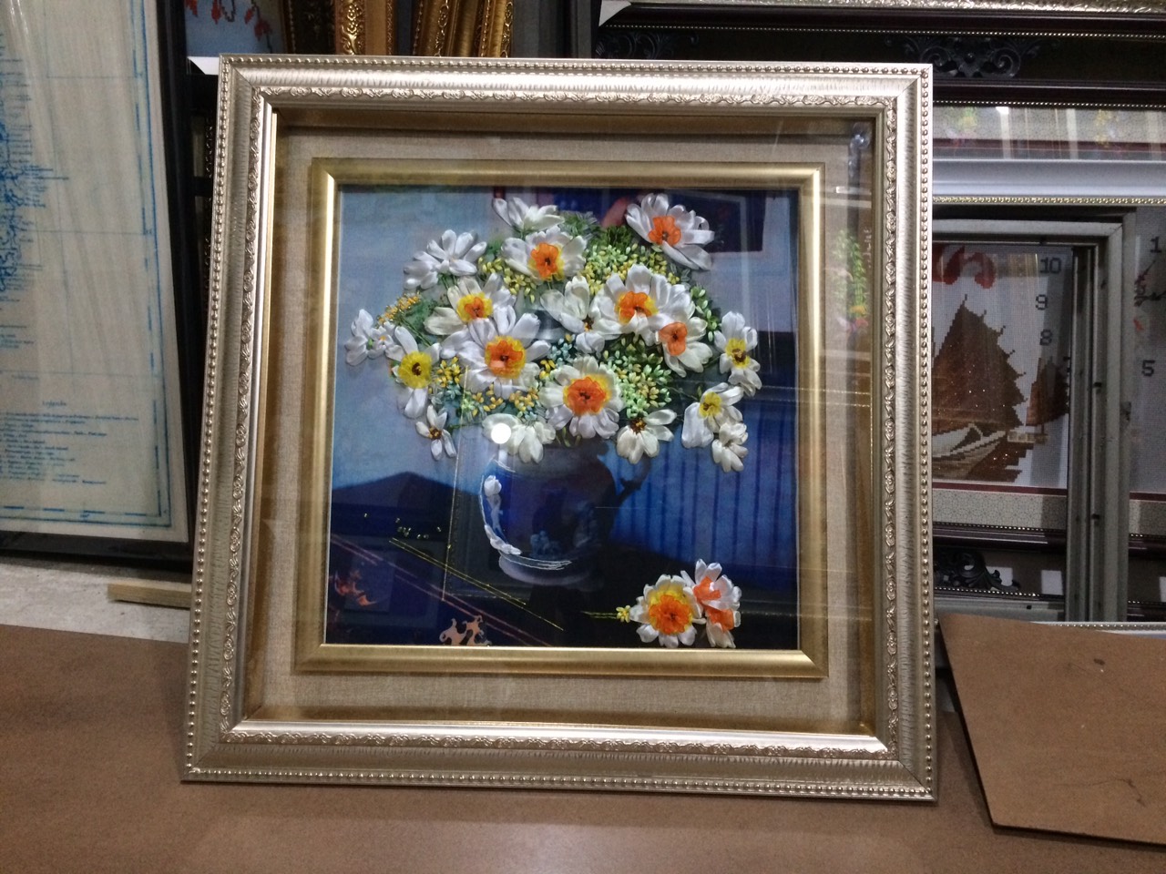 TRANH THÊU RUY BĂNG: BÌNH HOA CÚC HỌA MI